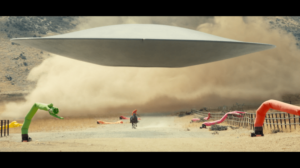 With that said, you can always expect great performances out of his films no matter what. The day of seeing Kaluuya re-teaming with Peele again has finally come true. His performance as OJ is undoubtedly more quiet and reserved, quite the opposite of Palmer’s energetic Emerald when we first see these two on-screen together. And it was no shock Keke Palmer carried the film and proved to be the standout, finding their sibling dynamic between him and Kaluuya pretty likable that most can relate to if you also have a brother or sister. I didn’t know Brandon Perea before this, as well as others. Still, he was phenomenal as Angel, a Fry Electronics (RIP) sales associate who helps them after setting up surveillance on their ranch. It’s always good to see Michael Wincott as the deep-voiced cinematographer who constantly searches for the perfect shot. Steven Yeun as Ricky Park had little to do. Instead, we got to explore his traumatizing childhood involving cutting back to an intense subplot of this incident with a chimpanzee named Gordy rampaging on a late ’90s sitcom. Although maybe there’s a connection I didn’t get, I had questions about why we kept going back to them and what it added to the story.