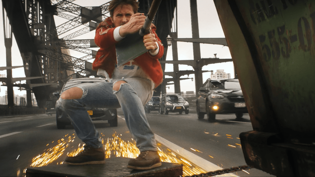 Talking about the action of it all, it never disappoints, putting trust in Leitch’s court to make them excited one after the other thanks to the work of the stunt performers and having them look practical. Whether during the filming of this ridiculous fictional movie poking fun at Dune or anywhere Colt has to get out of trouble, it doesn’t need to be gritty, but the team over at 87North continues to have these set pieces well-crafted. Learning this broke the record for the most cannon rolls captured on film is even more significant. Anyone asking for a sequence of Gosling riding on the back of a dumpster truck while on the Sydney Harbor with an adorable dog might not be out there, and yet it’s in here, along with a song pretty hilarious in its contract. Nothing’s too over the top compared to some recent movies that have us suspend disbelief.